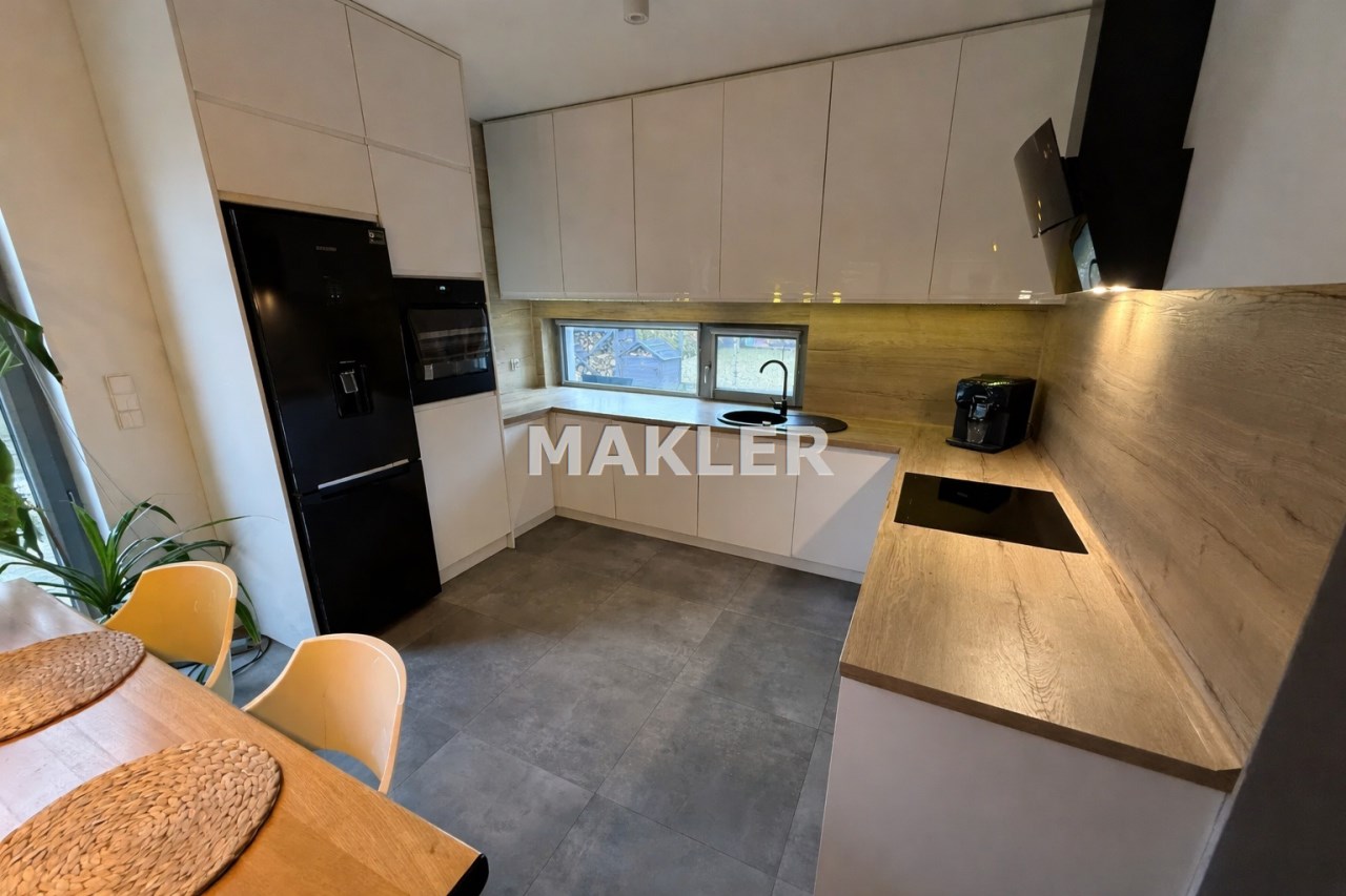 Wnętrze domu zostało wykończone w nowoczesnym, spójnym stylu z dbałością o detale. Centralną częścią jest jasny salon z aneksem kuchennym i wyjściem na taras, ozdobiony efektowną ścianą z białej cegły oraz dekoracyjnymi lamelami. W salonie znajduje się również klasyczny kominek, który tworzy przytulną atmosferę w chłodniejsze dni. Dom oferuje trzy komfortowe sypialnie, elegancką łazienkę z prysznicem, praktyczną garderobę oraz kotłownię. Dodatkowym atutem jest poddasze wyłożone płytą OSB (wysokość w szczycie ok. 2,5 m), które stanowi doskonałą przestrzeń magazynową.