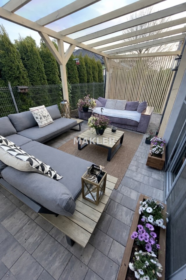 Działka została zaprojektowana z myślą o wygodzie i relaksie. Znajduje się tu drewniana, umeblowana altana, strefa treningowa z drążkami do ćwiczeń, a także estetyczna drewutnia. Ogród utrzymywany jest dzięki automatycznemu systemowi nawadniania, zasilanemu z własnej studni głębinowej, co znacząco obniża koszty pielęgnacji zieleni. Podjazd wyłożony kostką brukową zapewnia miejsce parkingowe dla dwóch samochodów.