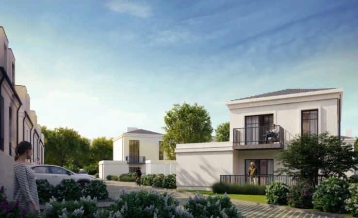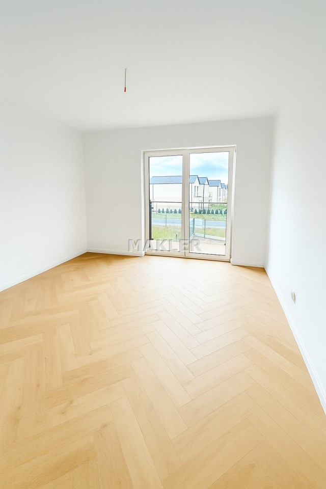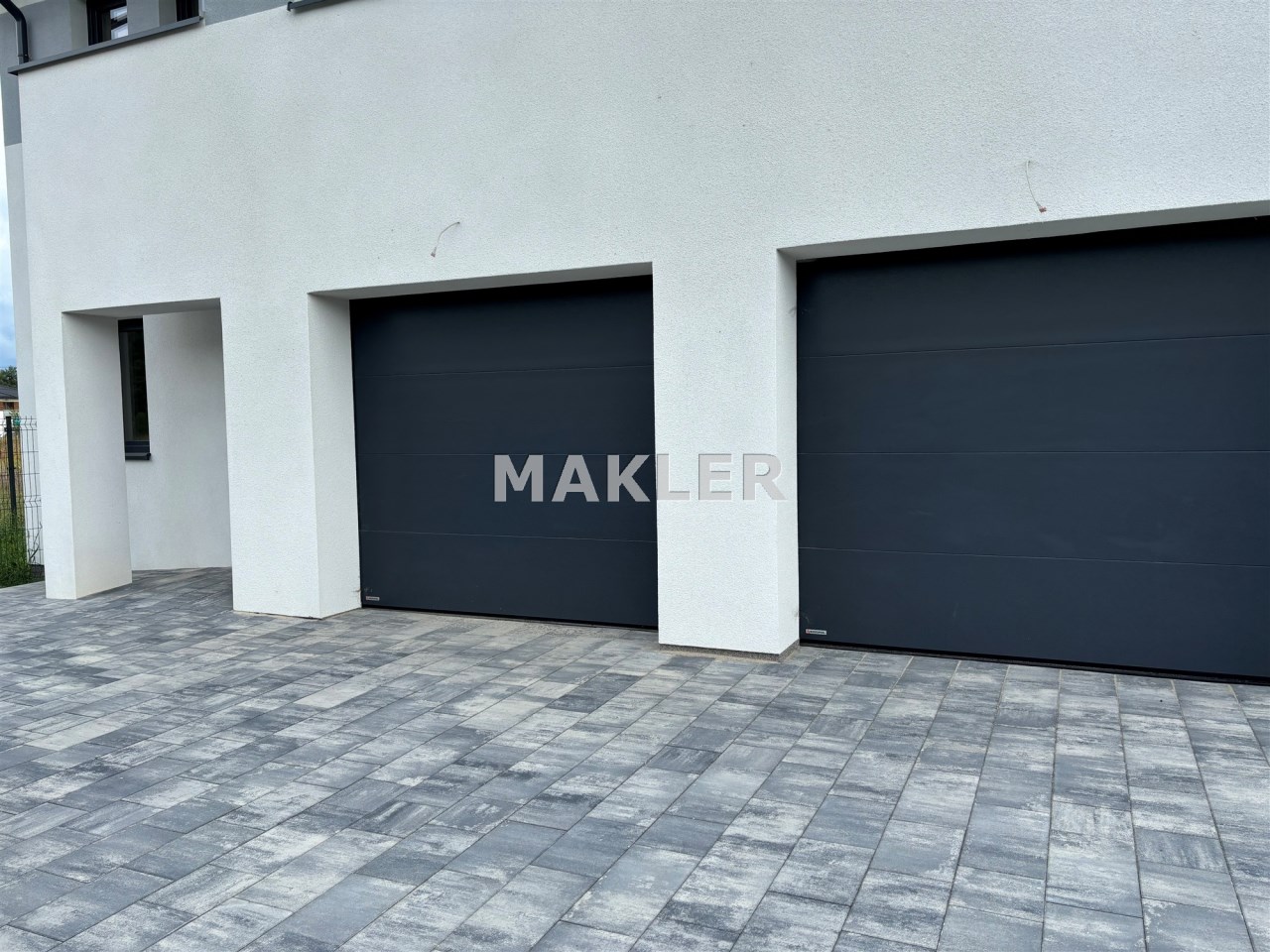 Na zewnątrz kostka betonowa na podjeździe i na tarasie oraz grafitowe ogrodzenie panelowe.