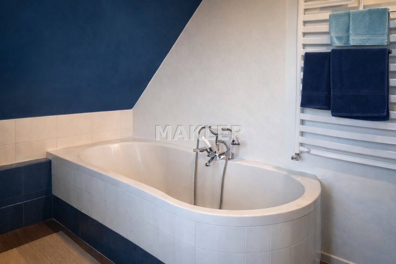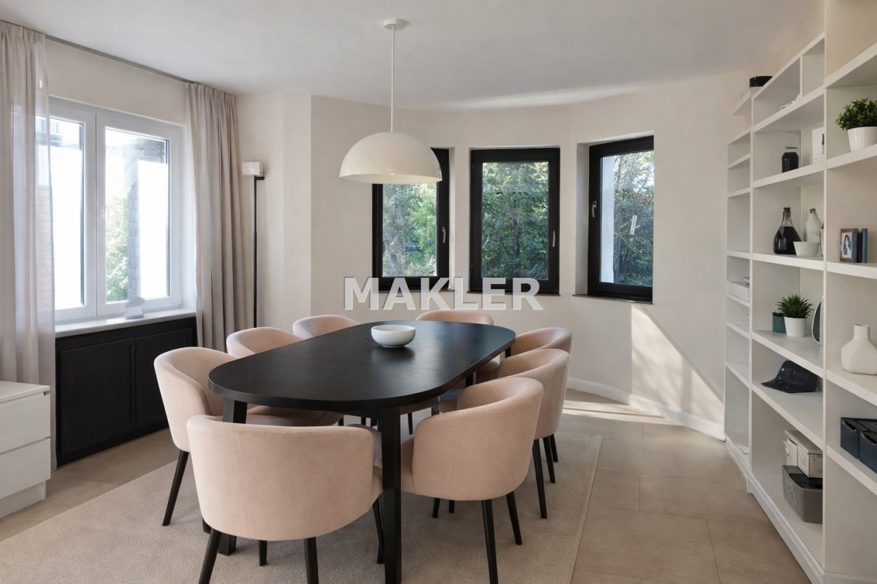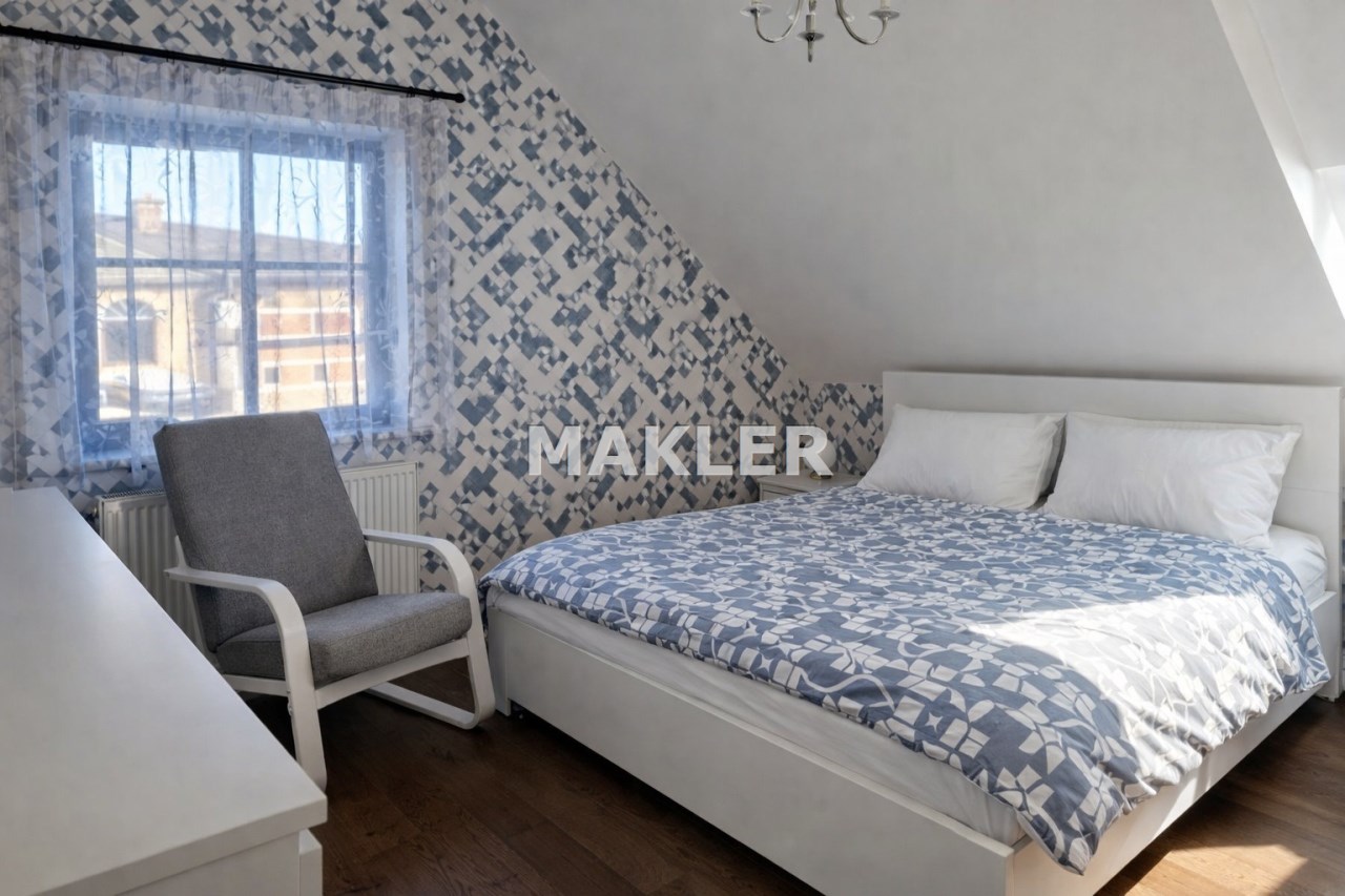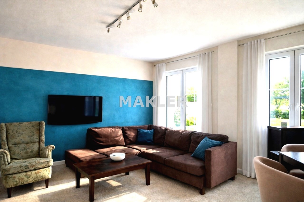 Na parterze znajduje się przestronny salon z jadalnią oraz aneksem kuchennym, z którego prowadzi wyjście na taras i ogród. Kuchnia pozostaje w pełnej zabudowie wraz ze sprzętem AGD. Na tej kondygnacji znajduje się również funkcjonalna przestrzeń dzienna zapewniająca wygodę codziennego użytkowania.