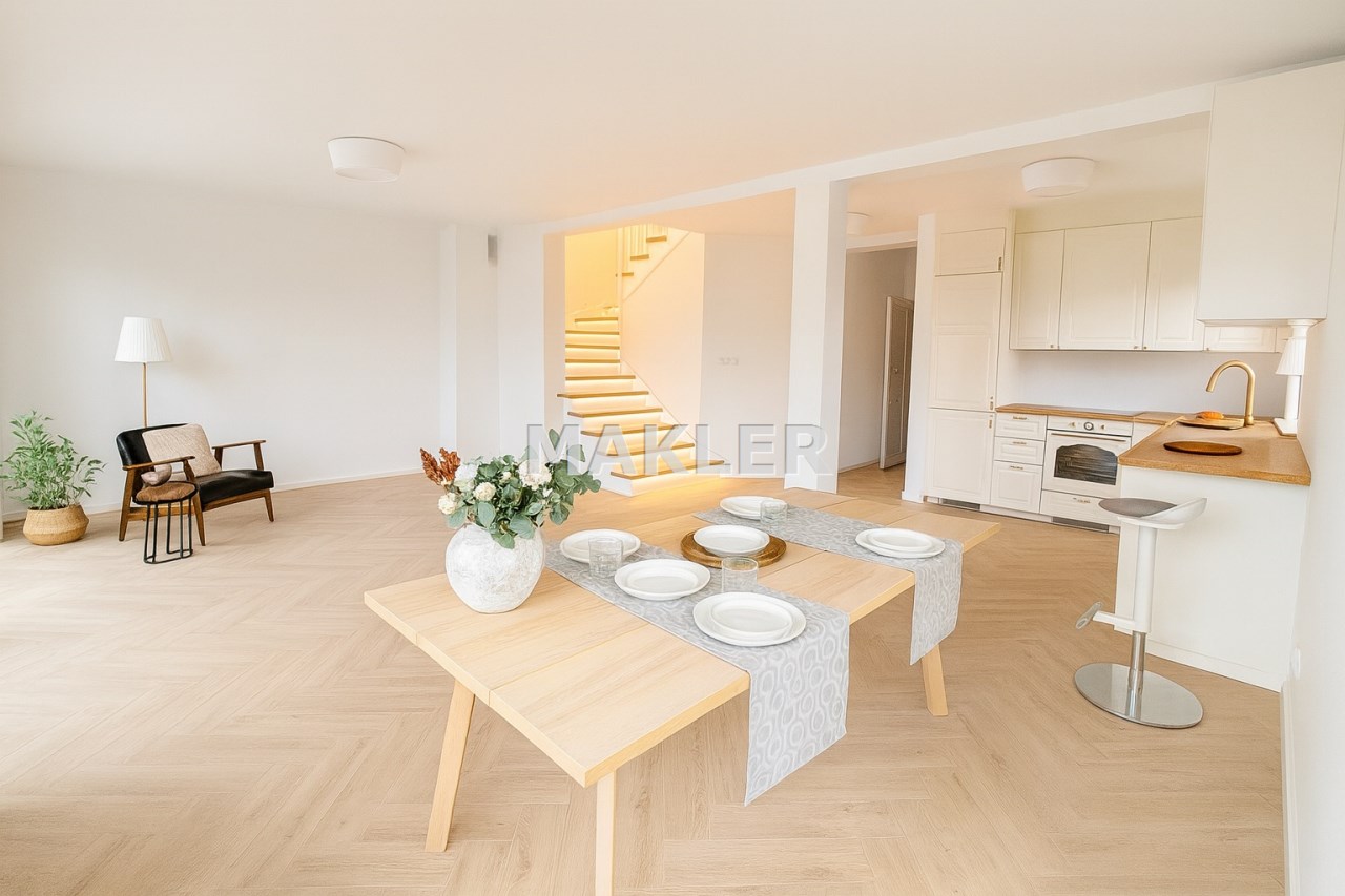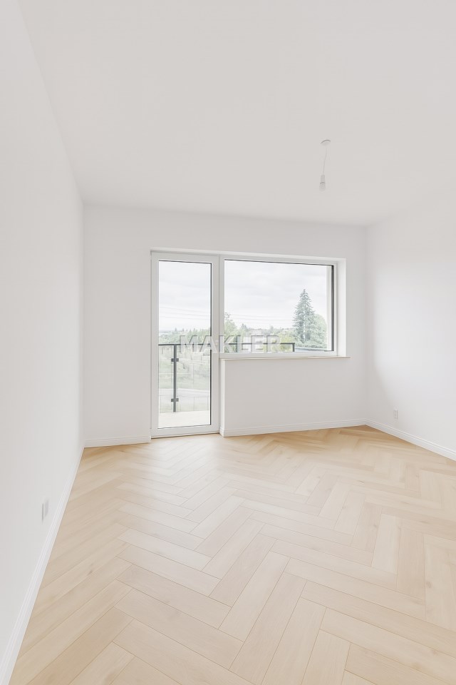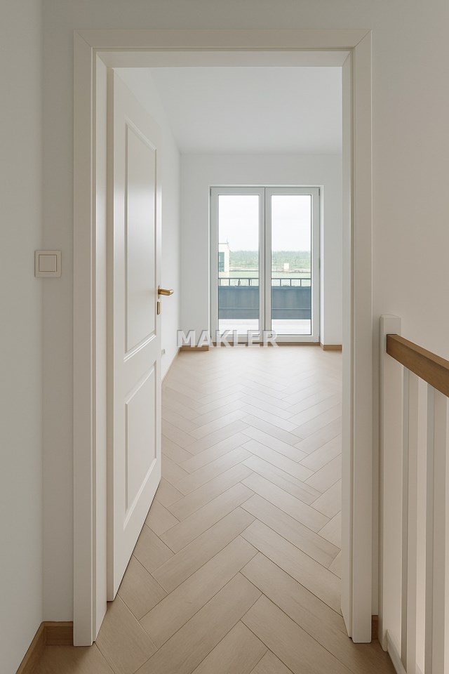 Na zewnątrz kostka betonowa na podjeździe i na tarasie oraz grafitowe ogrodzenie panelowe.