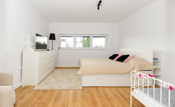 Trzy domy w zabudowie szeregowej w nowoczesnej willi mieszkaniowej. W parterze zlokalizowana przestrzeń dzienna z salonem, garażem, toaletą i pomieszczeniem gospodarczym. Na piętrach wybudowano cztery sypialnie i łazienkę.