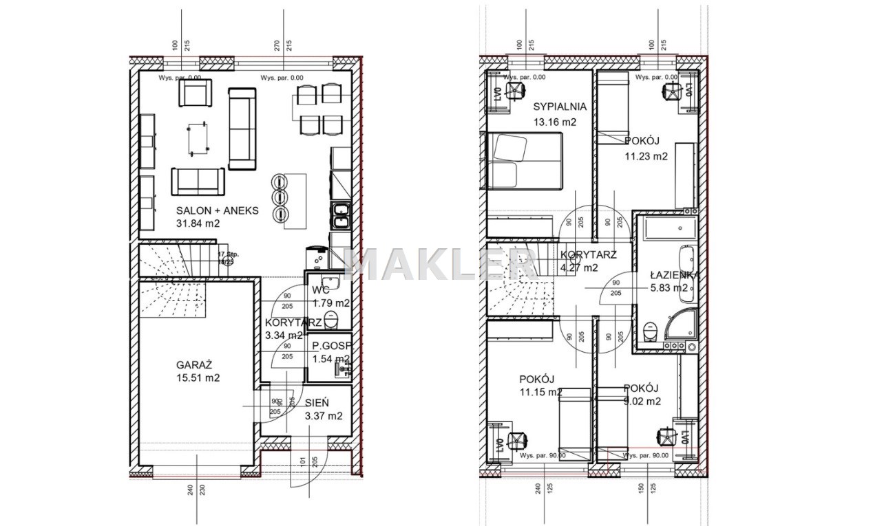Trzy domy w zabudowie szeregowej w nowoczesnej willi mieszkaniowej. W parterze zlokalizowana przestrzeń dzienna z salonem, garażem, toaletą i pomieszczeniem gospodarczym. Na piętrach wybudowano cztery sypialnie i łazienkę.