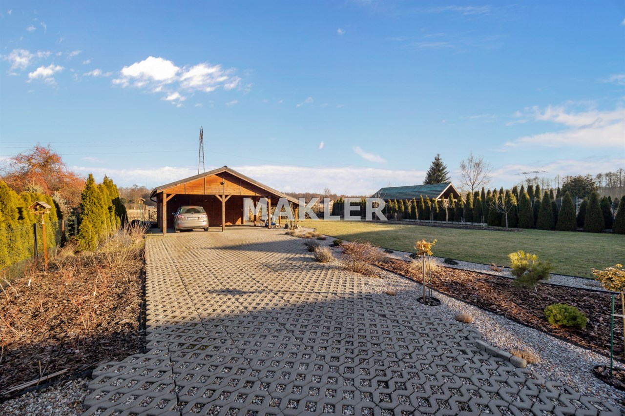 Na posesji znajduje się również wiata na dwa samochody oraz schowek na sprzęty ogrodowe lub rowery..