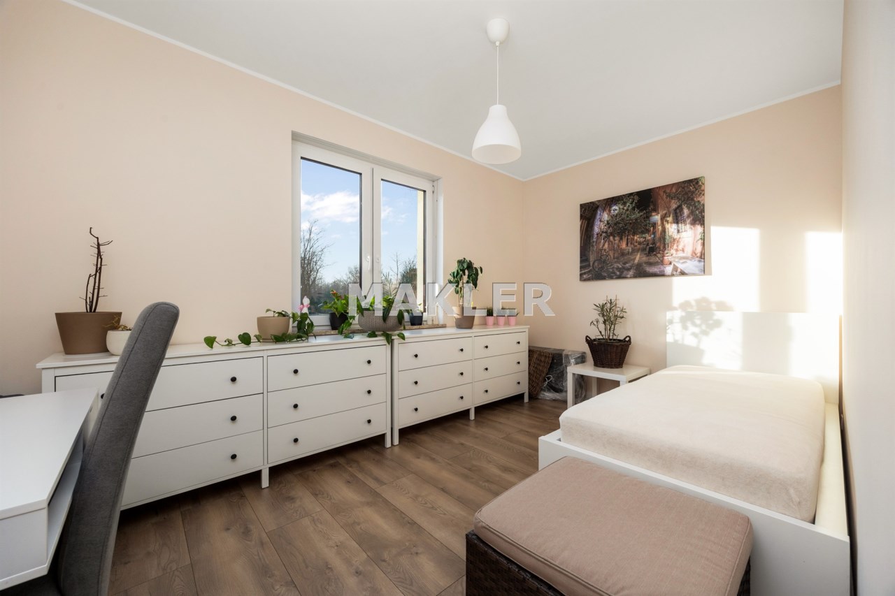 Dom oferuje cztery oddzielne pokoje, które mogą pełnić funkcję sypialni, pokoju dziecięcego, gabinetu lub dodatkowej przestrzeni gościnnej. Jedna z sypialni została wyposażona w zabudowane szafy garderobiane, zapewniające wygodne i estetyczne miejsce do przechowywania.