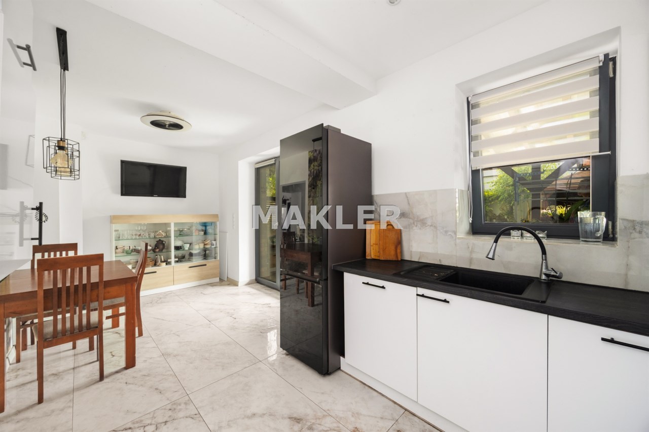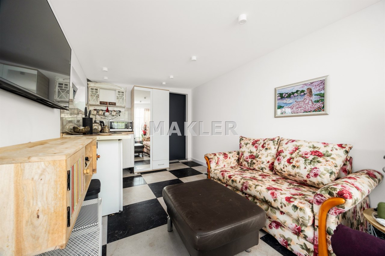Dodatkowym atutem jest domek gościnny o pow. ok. 18m2, w którym zaaranżowano salon z aneksem kuchennym oraz łazienkę. Może to być przestrzeń zarówno dla gości, może służyć jako miejsce na siłownię lub pokój gier lub jako gabinet do pracy.