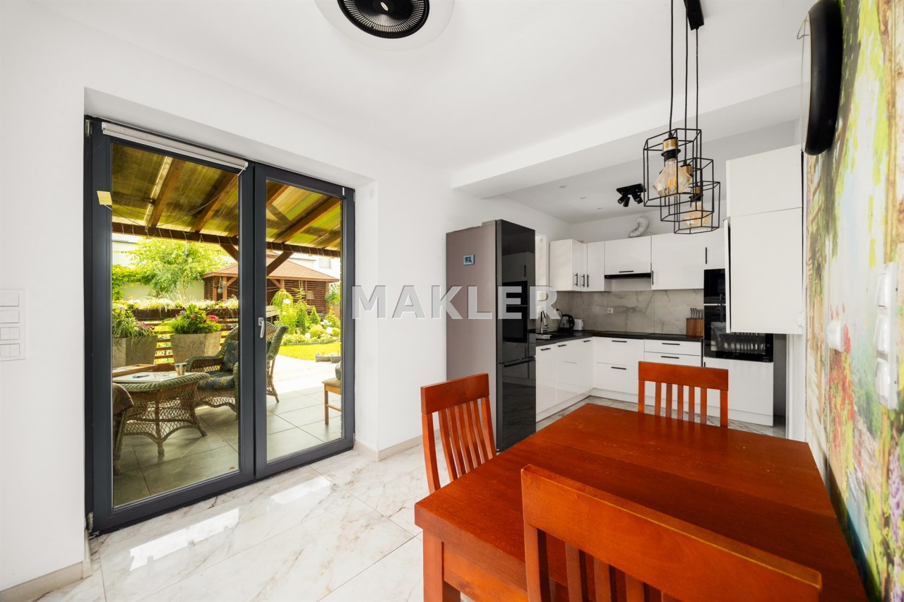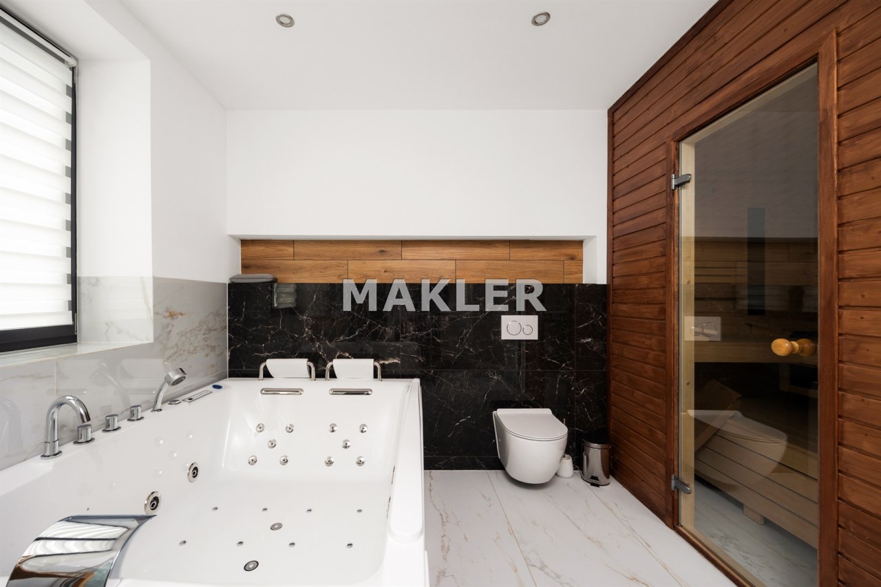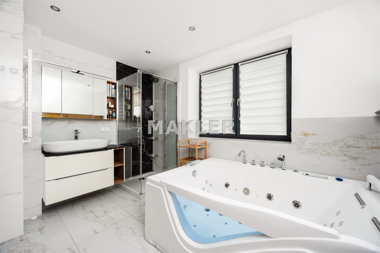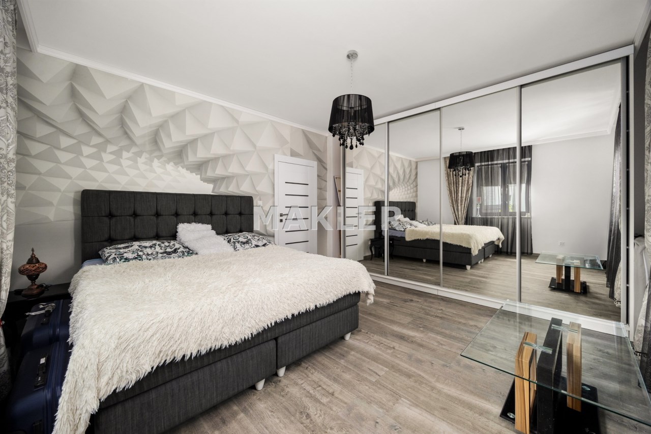 Wnętrze domu zostało urządzone z dbałością o funkcjonalność . Zadbano o miejsce zarówno do gotowania dla miłośników kuchni oraz przestronne sypialnie aby każdy miał swoją prywatną przestrzeń jeśli jej potrzebuje. Duże i pojemne zabudowy w pokojach gwarantują miejsce do przechowywania rzeczy i tym samym utrzymanie porządku. Łazienka została wyposażona w rodzinną wannę z hydromasażem, prysznic oraz nowoczesną saunę co sprawia, że możesz w zaciszu własnego domu poczuć się jak w SPA.