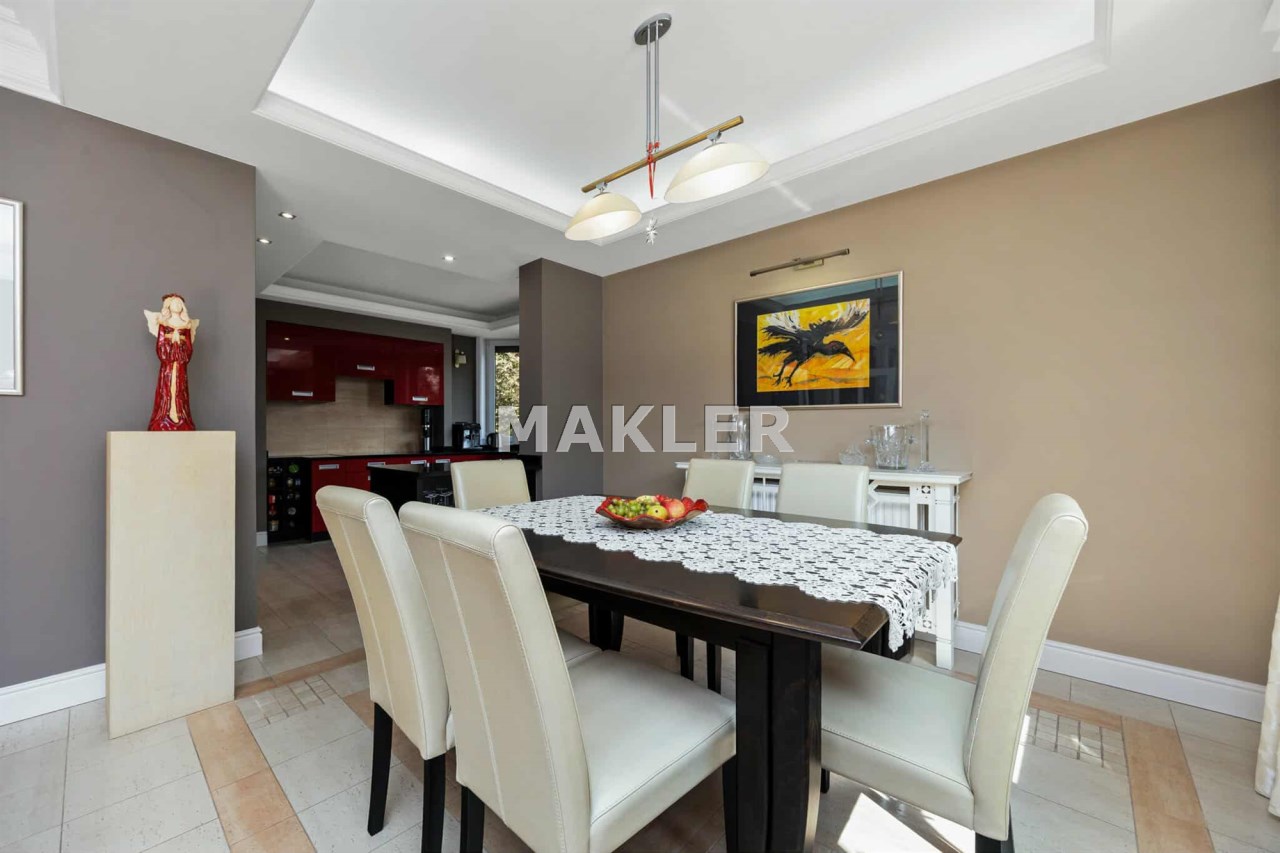 Tuż obok znajduje się jadalnia, w której każdy posiłek może stać się okazją do rozmów i śmiechu, oraz elegancka, pojemna kuchnia z ogrzewaniem podłogowym – miejsce, w którym gotowanie staje się przyjemnością.