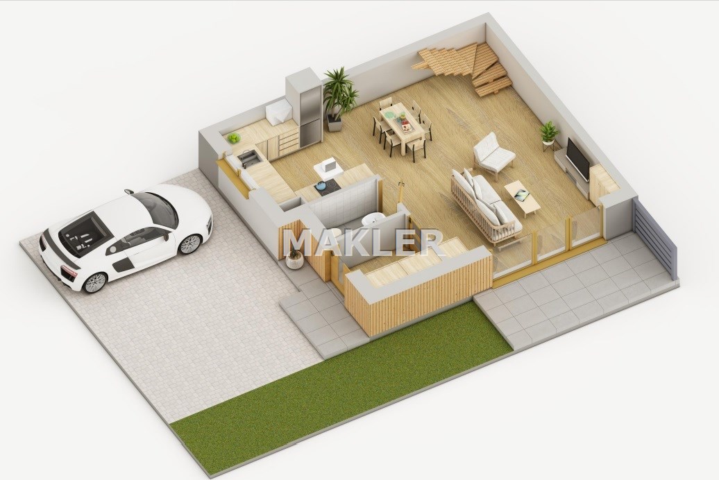 Parter: przestronny salon z aneksem kuchennym oraz wyjściem na duży taras, przedsionek, łazienka.