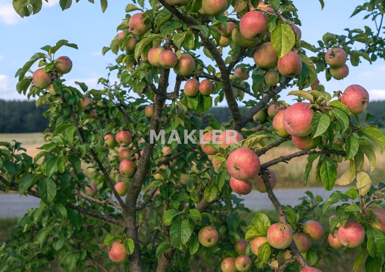 działka z pięknym, zadbanym sadem – 5500 m², obsadzona ok. 300 drzewami owocowymi (m.in. stare odmiany jabłoni, śliw, grusz, wiśnie, morele, brzoskwinie, winorośle oraz jeżyny).