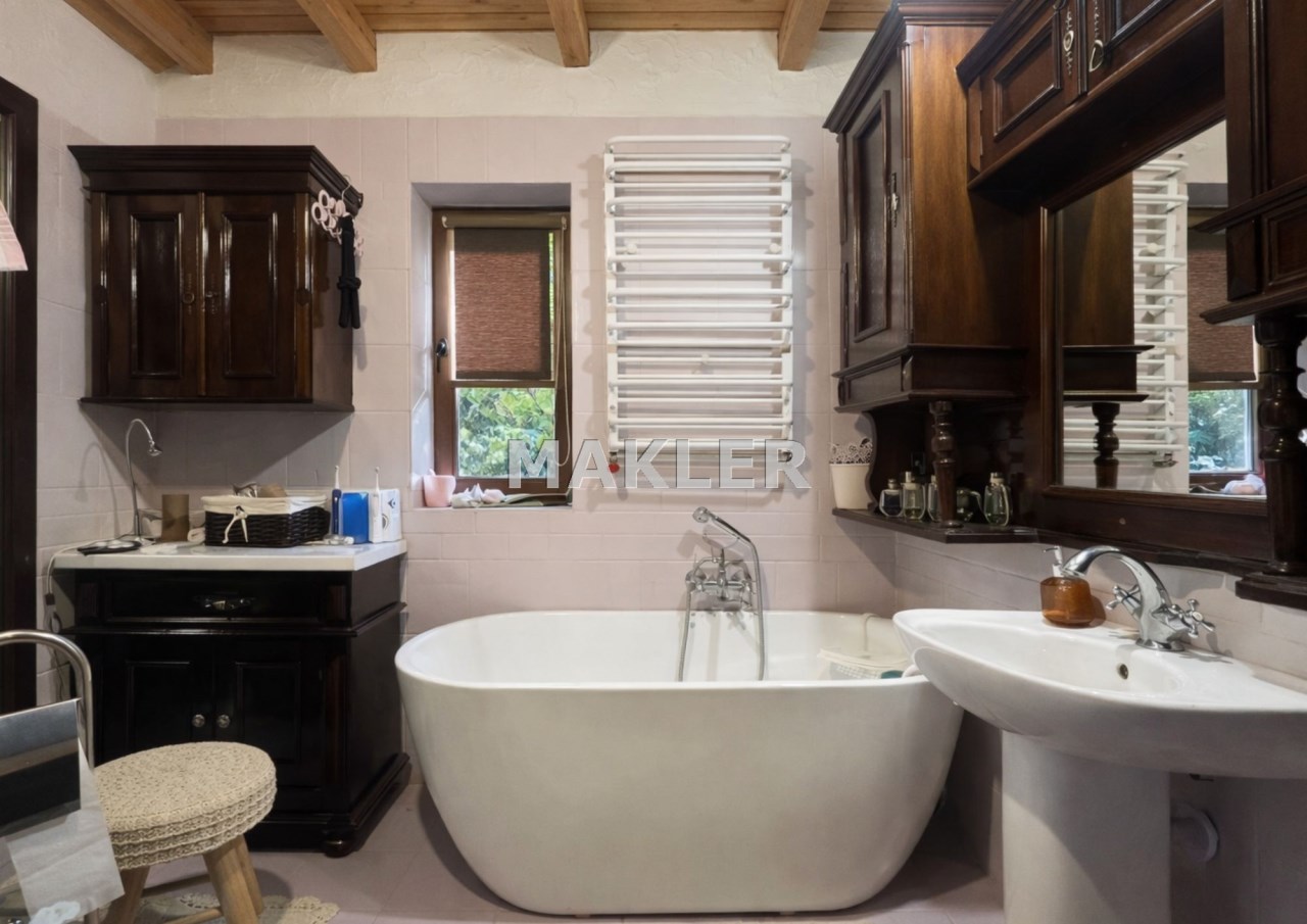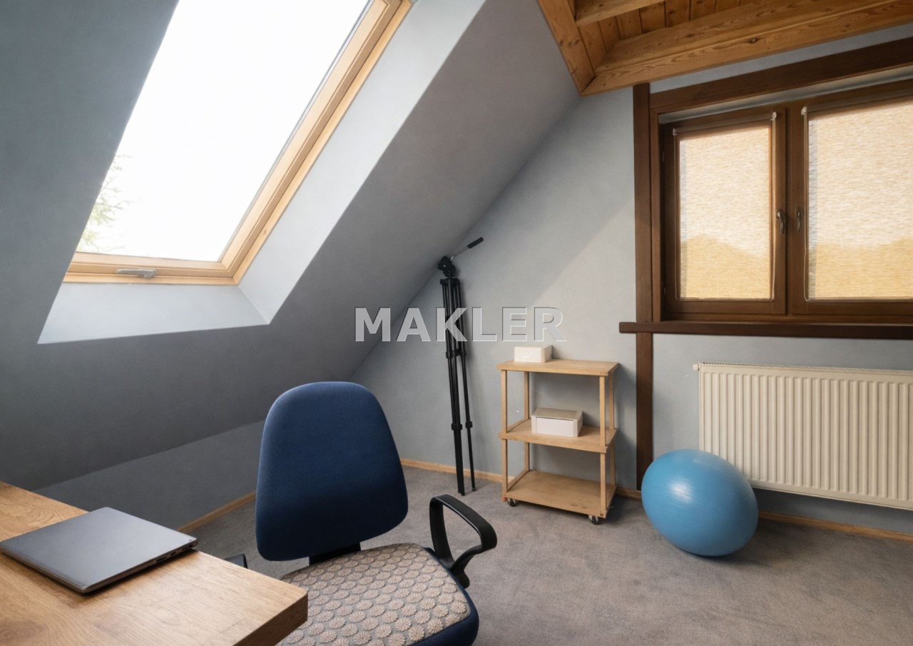 Na działce znajduje się również wolnostojący budynek garażowo-gospodarczy o powierzchni 39 m² z wiatą, ogrzewany z tego samego źródła co dom. Teren jest w pełni ogrodzony drewnianym ogrodzeniem i starannie zagospodarowany – liczne nasadzenia, drzewa, krzewy oraz kamienne ścieżki tworzą niepowtarzalny, klimatyczny charakter posesji.