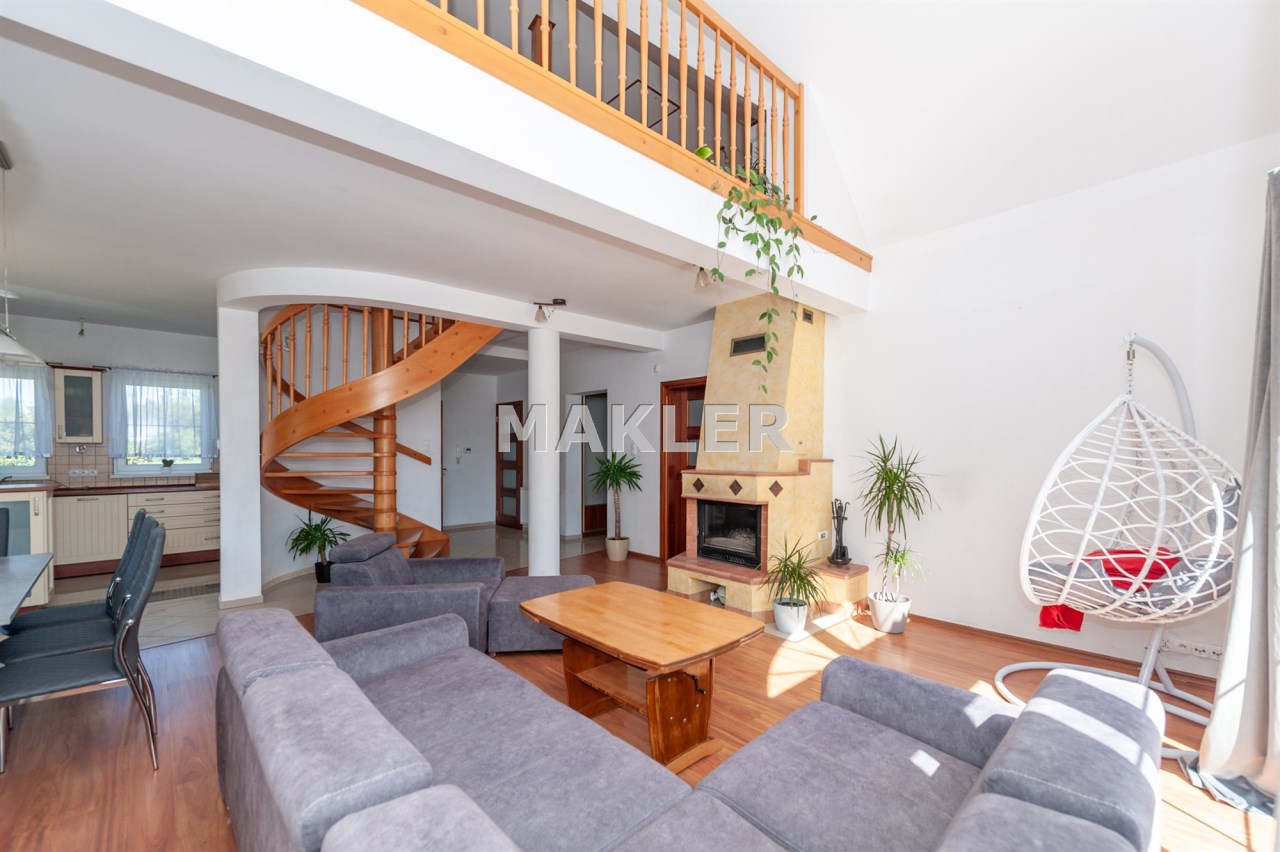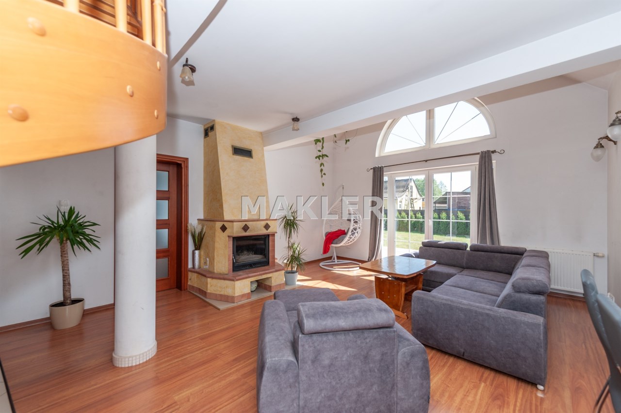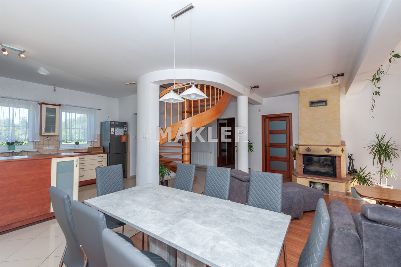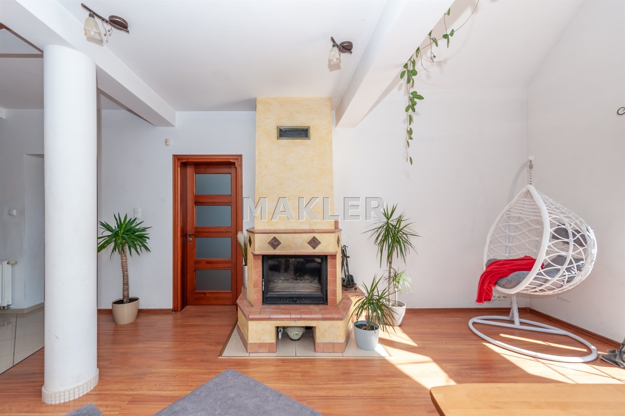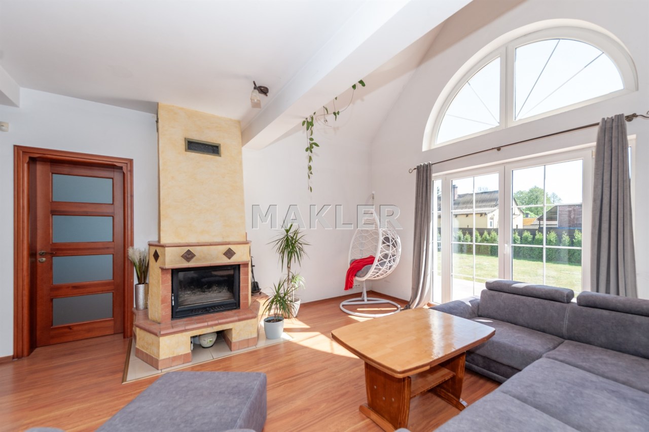 Przestronny salon z kominkiem z płaszczem wodnym oraz aneks kuchennyPiętro: