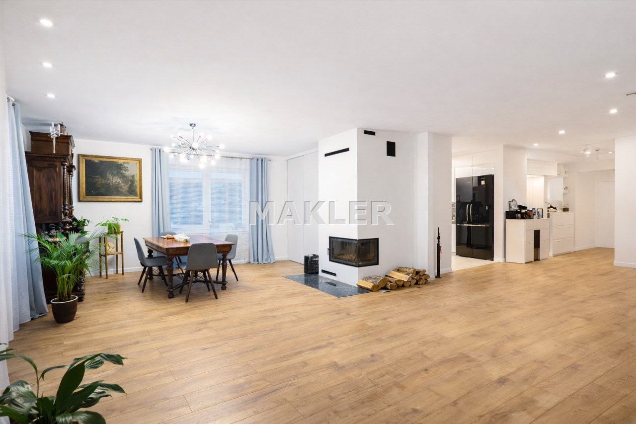 Salon jest doskonale doświetlony, a kominek tworzy wyjątkową atmosferę i zapewnia dodatkowe źródło ciepła w chłodniejsze dni.