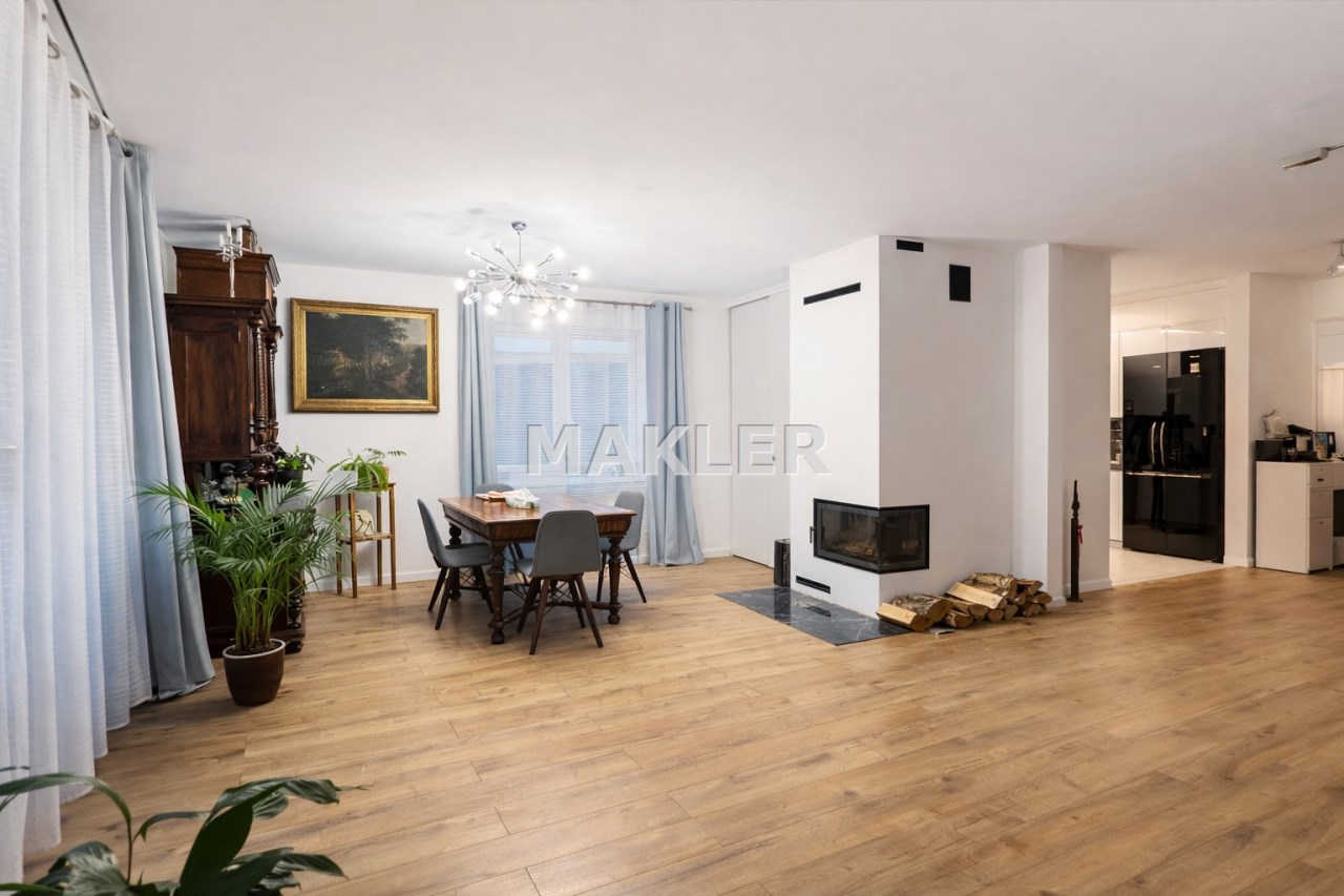 Salon jest doskonale doświetlony, a kominek tworzy wyjątkową atmosferę i zapewnia dodatkowe źródło ciepła w chłodniejsze dni.