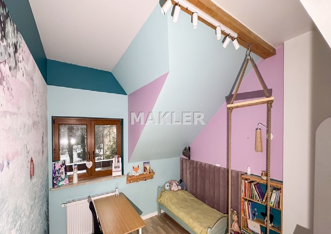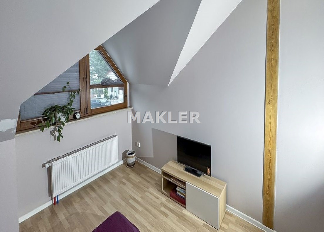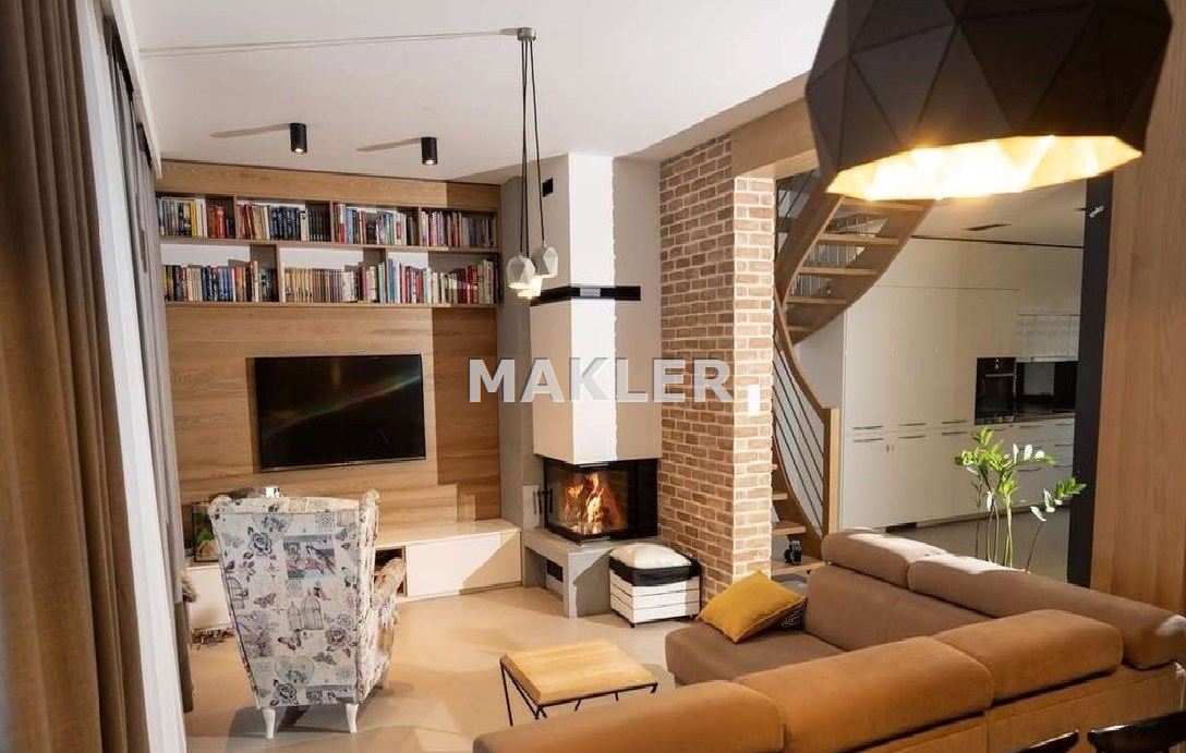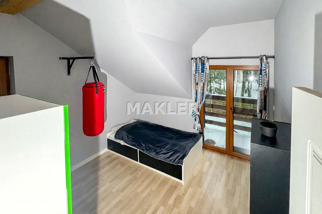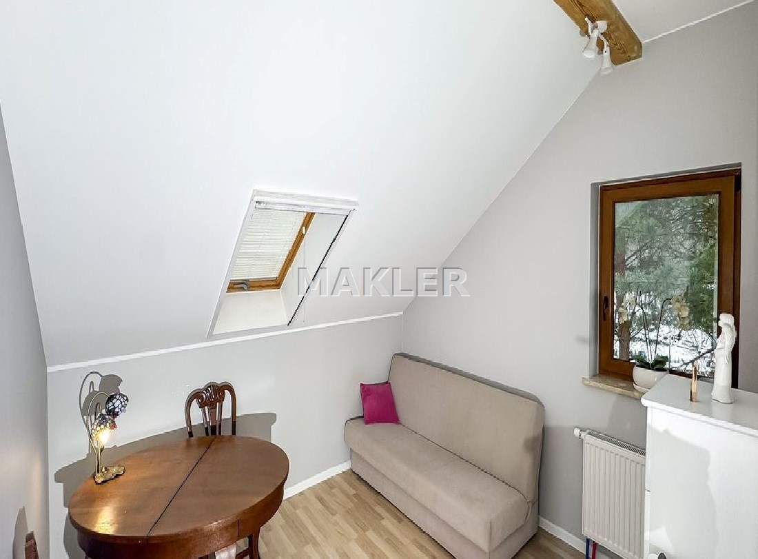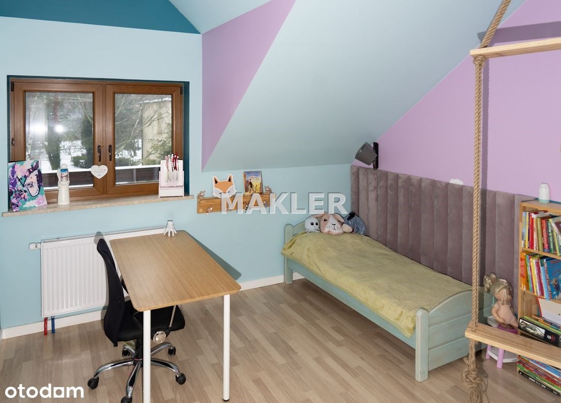 Wnętrze zostało urządzone w nowoczesnym lecz przytulnym stylu i stanowi enklawę dla rodzinnego życia ze wspólnymi wieczorami przy kominku. Duża, pięknie doświetlona naturalnym światłem i otwarta kuchnia wyposażona w sprzęty AGD. Elementy drewna, czerwonej cegły i bieli doskonale się komponują tworząc niebanalną, otwartą przestrzeń co docenią klienci ceniący ciekawe rozwiązania . Łazienka została wyposażona w wygodną wannę. W sypialniach obecnie zaaranżowano pokoje dziecięce i sypialnię lecz może tu powstać zarówno miejsce do odpoczynku jak i do pracy jeśli pracujesz zdalnie. Okna z widokiem na piękne leśne drzewa to coś wyjątkowego zwłaszcza w bliskiej zabudowie gdzie widok jest często na sąsiednie budynki. Idealne, skrajne położenie domu zapewnia intymność i spokój ze śpiewem ptaków. Na działce przygotowano teren pod budowę garażu.