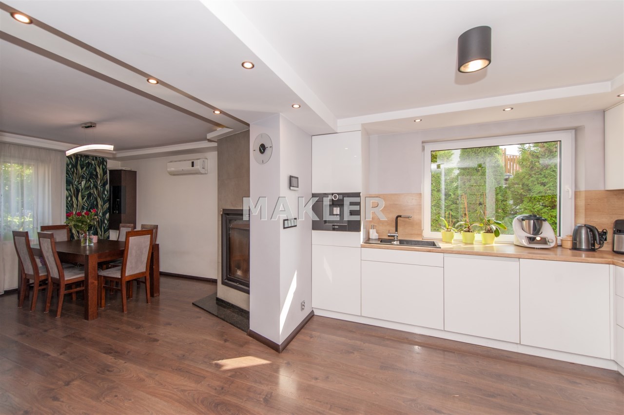 Kuchnia w pełni wyposażona w sprzęt AGD który oczywiście pozostaje tj.lodówka,piec,mikrofala,ekspres do kawy w zabudowie,zmywarka,okap,płyta indukcyjna.