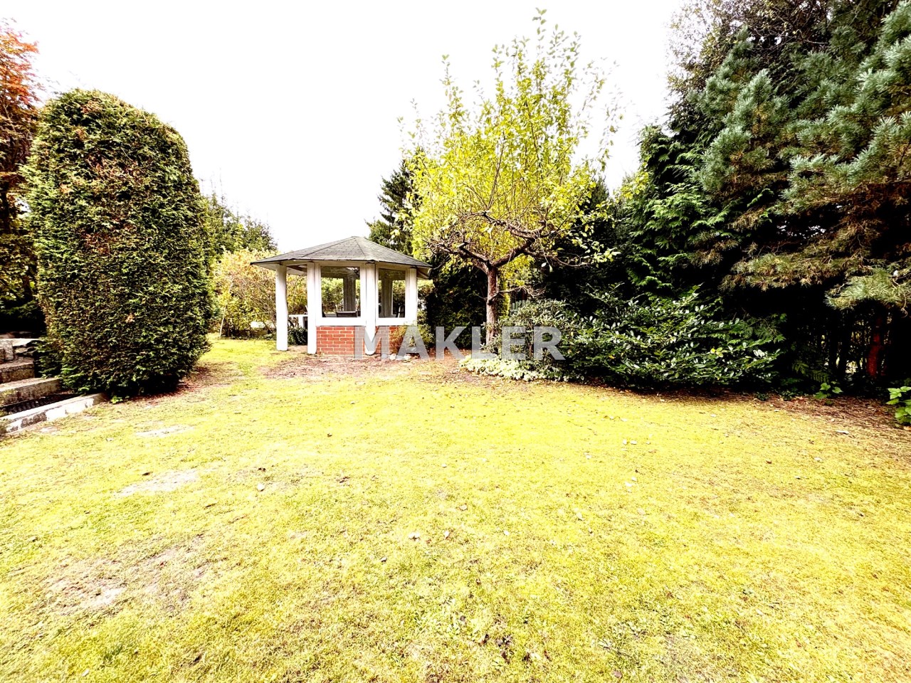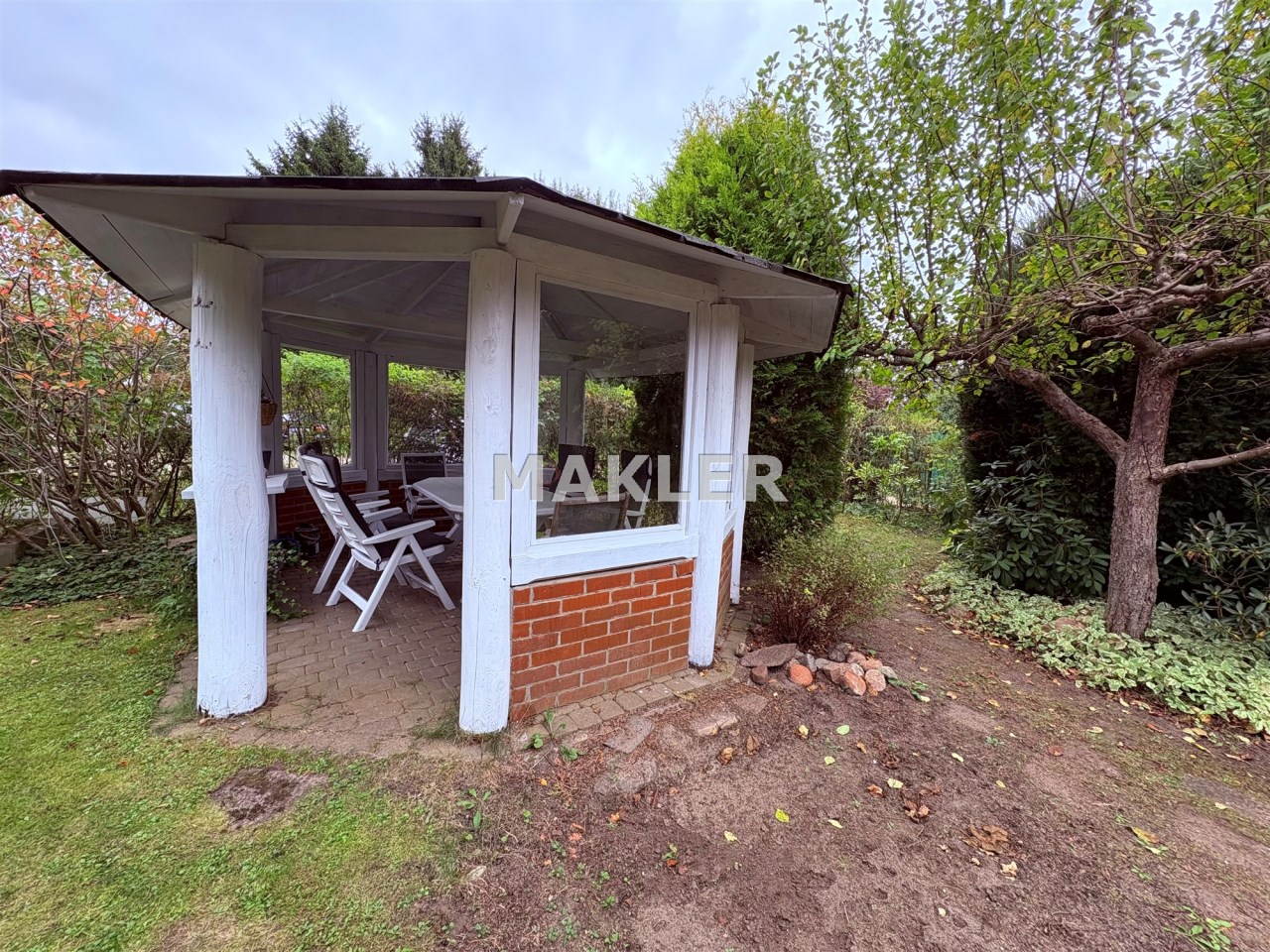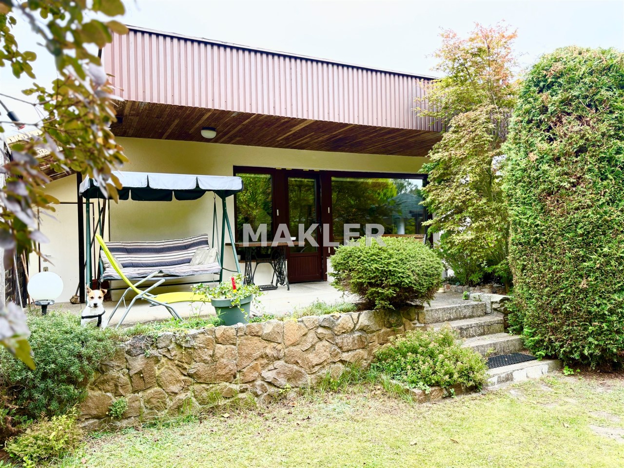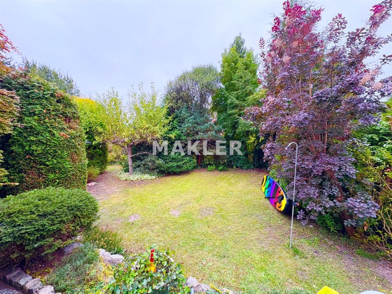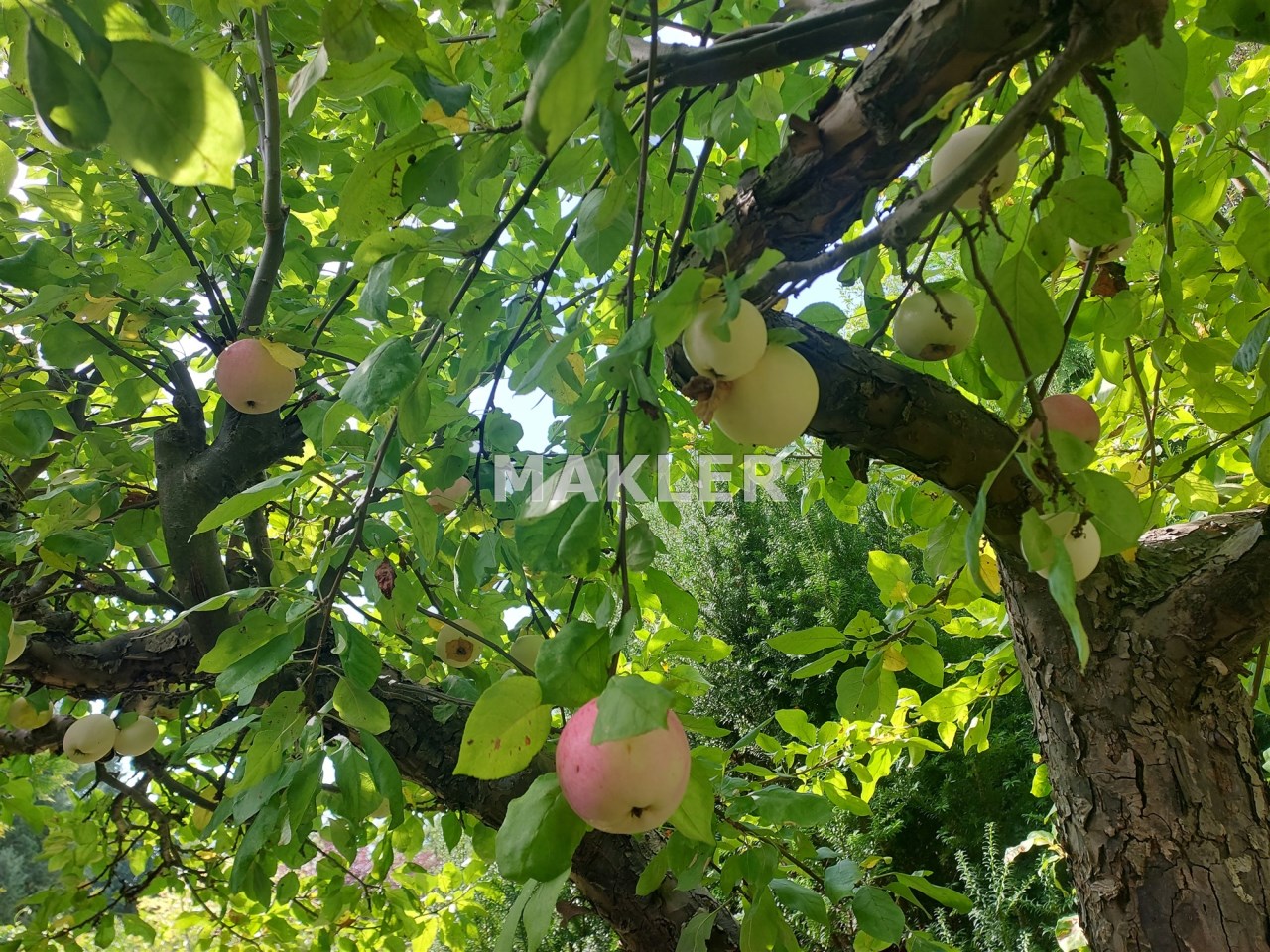Zadbano również o to by ogród cieszył właścicieli przez cały rok - znajdziesz tu pokaźne i wysokie drzewa jak klon o charakterystycznym czerwonym odcieniu, jabłoń - bogato owocującą, sosnę oraz iglaki o rozłożystych koronach, tuje oraz krzewy owocowe, które pozwolą zebrać własne owoce.
