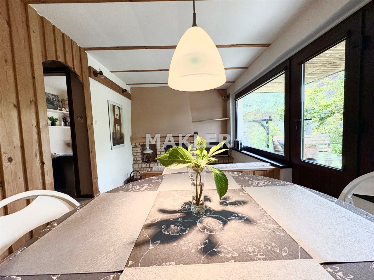 Funkcjonalne rozwiązania zastosowane podczas aranżacji wnętrza pozwalają na wygodne spędzanie czasu zarówno latem jak i w chłodniejsze pory roku np. jesienią.
