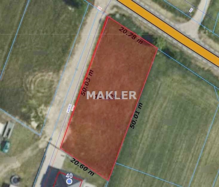 Ta ustawna działka o powierzchni 1045 m2 w kształcie prostokąta o wymiarach 50mx20m leży przy drodze asfaltowej i ma wydane warunki zabudowy na budowę budynku mieszkalnego jednorodzinnego.