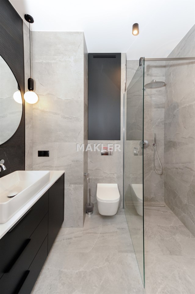 W mieszkaniu są 2 łazienki przy czym jedna przynależna do jednej z sypialni.Jedna z łazienek posiada wannę a druga kabinę prysznicową.