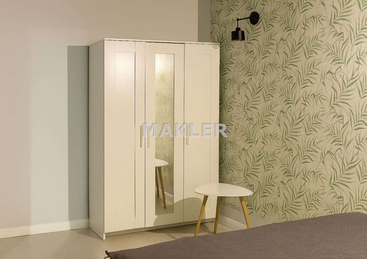 Szafa z lustrem oraz lekkie, designerskie stoliki pomocnicze zapewniają dodatkową przestrzeń do przechowywania i organizacji.