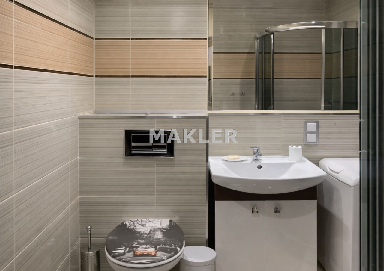 Łazienka została zaprojektowana funkcjonalnie i estetycznie. Znajduje się tu kabina prysznicowa, pralka, dużo miejsca do przechowywania kosmetyków oraz gazowy podgrzewacz wody.