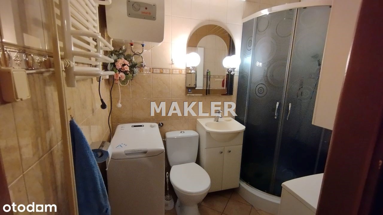 łazienka z WC w płytkach, z kabiną prysznicową, pralką automatyczną oraz ciepłą wodą z bojlera elektrycznego