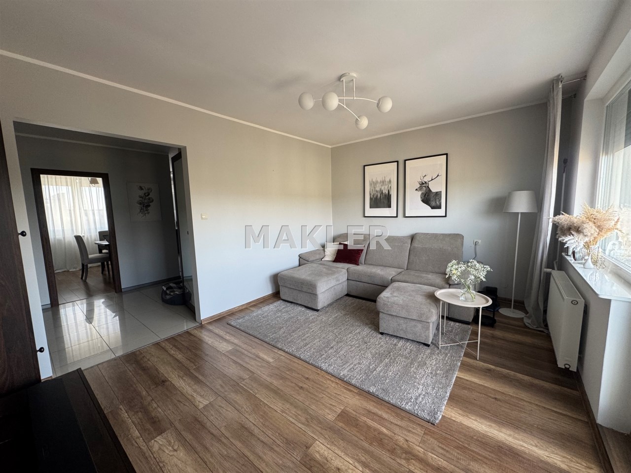 przestronny salon z wyjściem na balkon,