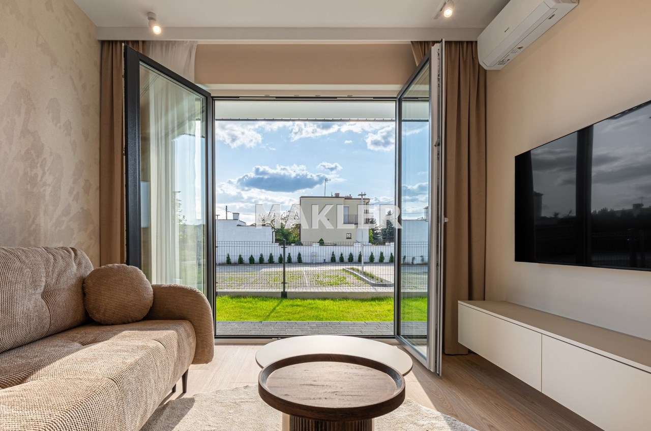 W mieszkaniu zainstalowano klimatyzację oraz nowoczesne oświetlenie. Wnętrze dopełniają starannie dobrane zasłony szyte na wymiar oraz stylowe dodatki. Zastosowano również drzwi wewnętrzne marki PORTA z wykończeniem odpornym na odciski palców.