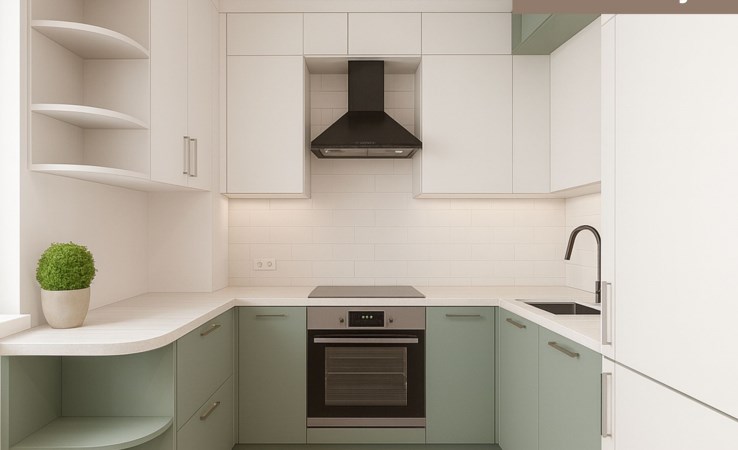 Wnętrze urządzone z użyciem mebli i zabudów stolarskich wykonanych na wymiar: nowoczesna kuchnia, zabudowa w przedpokoju, szafa w sypialni, meble łazienkowe oraz szafka RTV z przeszkloną witryną.