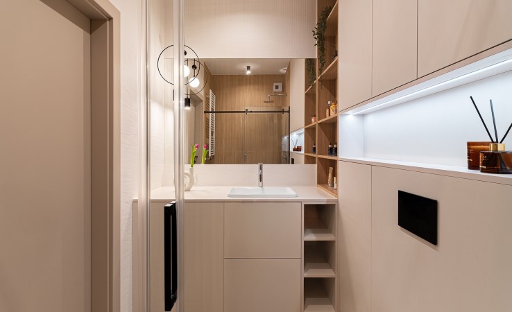 Wnętrze urządzone z użyciem mebli i zabudów stolarskich wykonanych na wymiar: nowoczesna kuchnia, zabudowa w przedpokoju, szafa w sypialni, meble łazienkowe oraz szafka RTV z przeszkloną witryną.