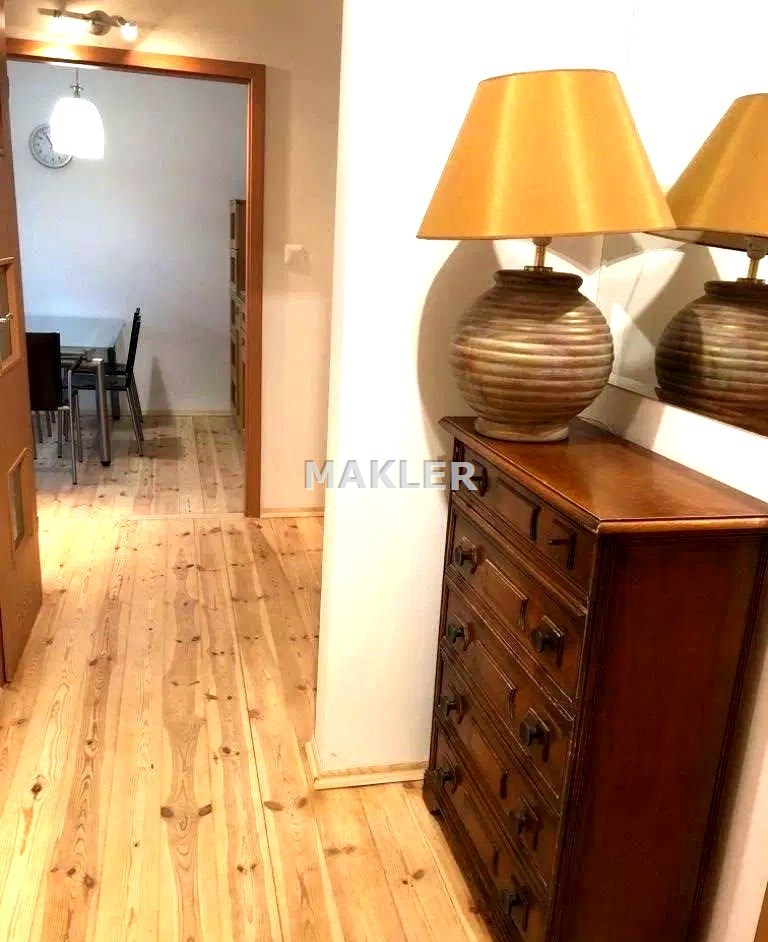 W całym mieszkaniu znajduje się drewniana podłoga, która nadaje wnętrzu elegancji i wyjątkowego charakteru.