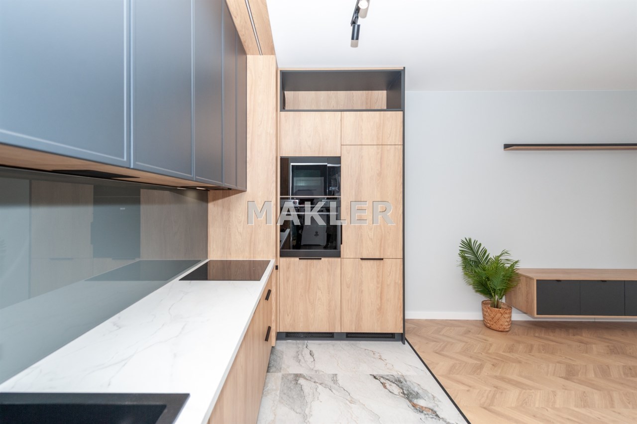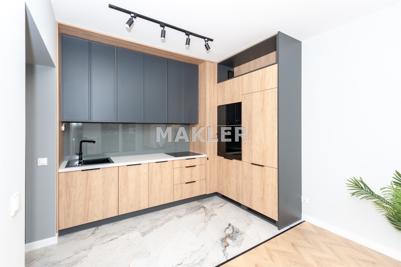 W pełni wyposażona kuchnia na wymiar, z nowoczesną armaturą oraz nowym sprzętem AGD w zabudowie.