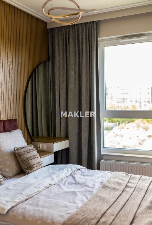 - salon: indywidualnie wykonana sofa z funkcją spania, witryny podświetlane automatycznie, TV 65". -sypialnia z łożem małżeńskim, szafy wg indywidualnego projektu, wykonane na zamówienie;