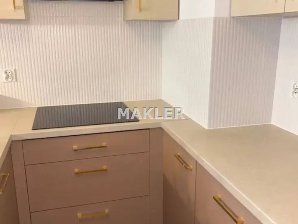 Mieszkanie zostało wykończone „pod klucz”, z wykorzystaniem zabudowy wykonywanej na wymiar przez stolarza. Wszystkie elementy zostały przemyślane tak, aby łączyć estetykę z funkcjonalnością.
