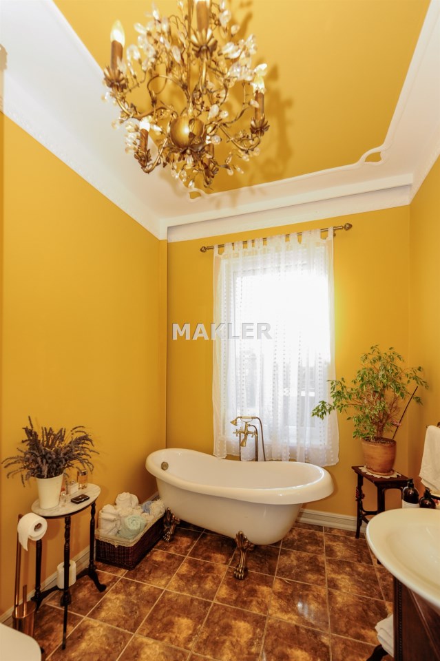 Łazienka zasługuje na uwagę ze względu na rozmiar. Jest to właściwie pokój kąpielowy, który ma zapewnić komfort i relaks. Okno daje naturalne światło. Wolnostojąca wanna na pozłacanych nogach dopełnia styl i klasę tej nieruchomości.