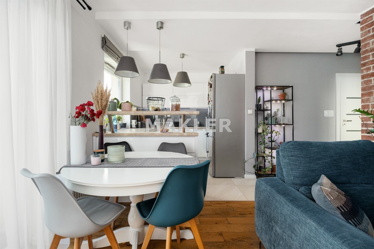 Wnętrze zostało zaprojektowane tak, by od razu czuć się jak w domu: cegła na ścianie podkreśla unikalny charakter, a elementy drewna i neutralne kolory tworzą ciepły, nowoczesny klimat, który pokochasz. Na uwagę zasługuje również podloga w salonie z piękna dębową deską co stwarza ciepło i podkreśla styl.