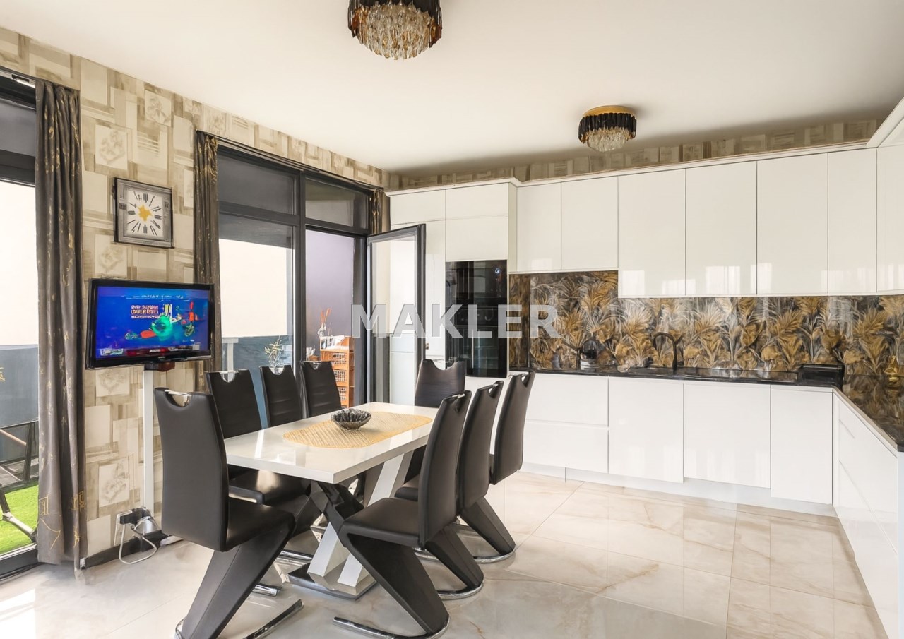 Kuchnia – elegancka zabudowa meblowa wraz z kompletnym sprzętem AGD: piekarnik, płyta indukcyjna, mikrofalówka, okap, zmywarka oraz lodówka.