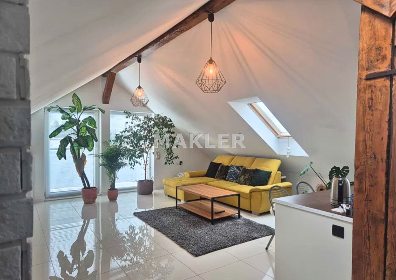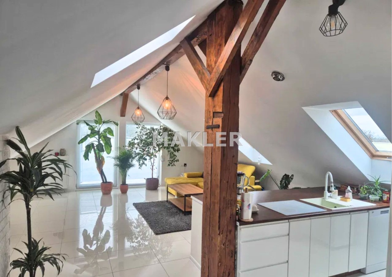 - bardzo duży i klimatyczny salon z aneksem kuchennym oraz toaleta prawie 60m2 po podłodze .