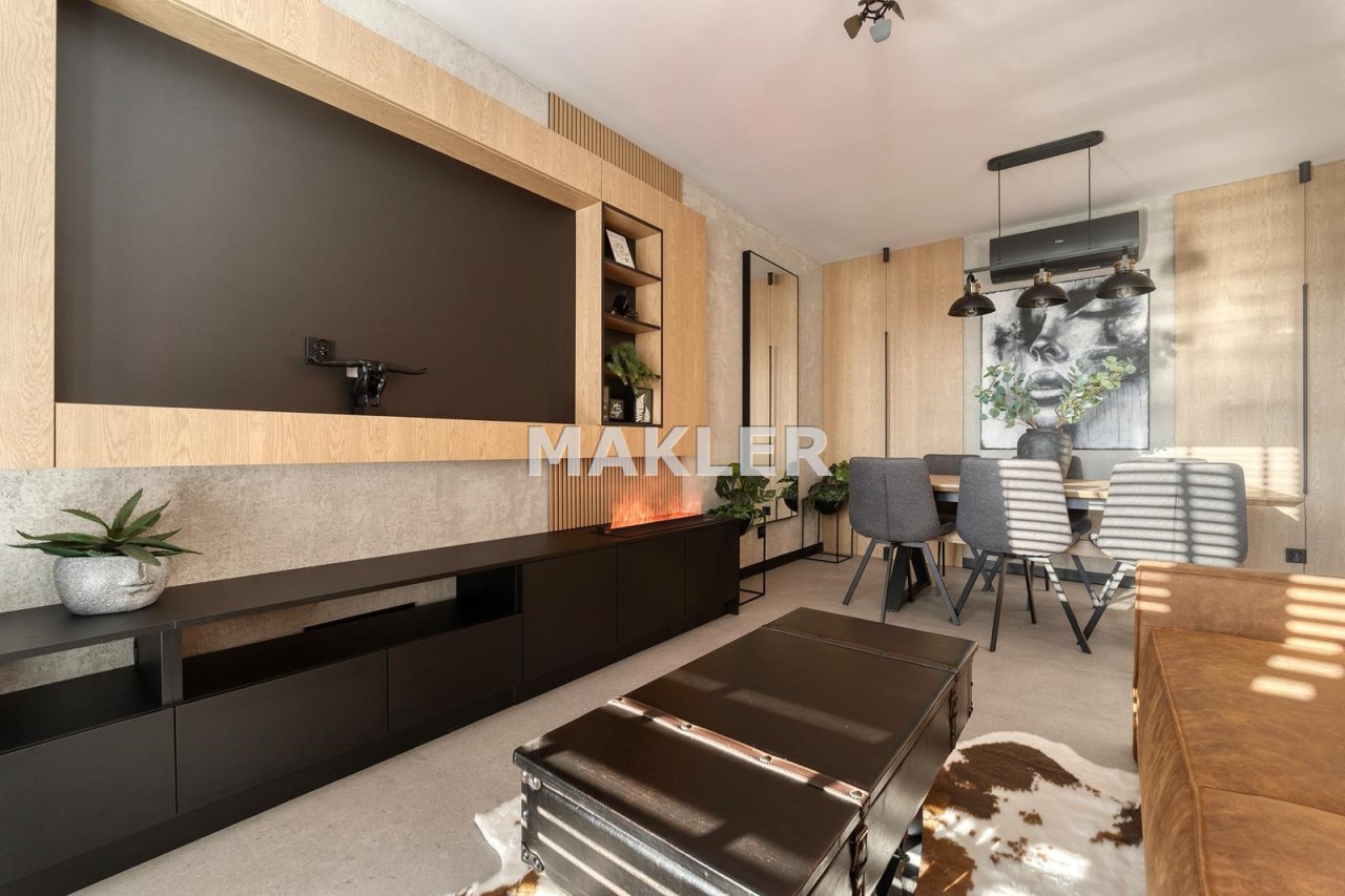 Część dzienna urządzona została m.in. w rozkładaną sofę, elegancki stół, designerskie obrotowe krzesła, stolik kawowy oraz kominek, który nadaje wnętrzu wyjątkowej, luksusowej atmosfery.