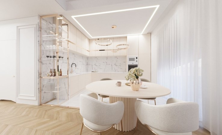 Zabudowa stolarska, systemy szuflad Blum Servo-Drive, wysokiej klasy AGD Samsung Chef Collection (piekarnik, płyta indukcyjna, lodówka, zamrażarka, zmywarka w zabudowie)